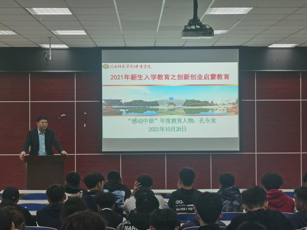 10月28日晚上7:00,bbin宝盈集团平台首页在体育馆多媒体员工举行2021年新生入学教育之创新创业启蒙教育,本次讲座由“感动中原”年度教育人物孔令龙主讲,21级全体同学参加,活动由院党委副书记柴九昌主持。